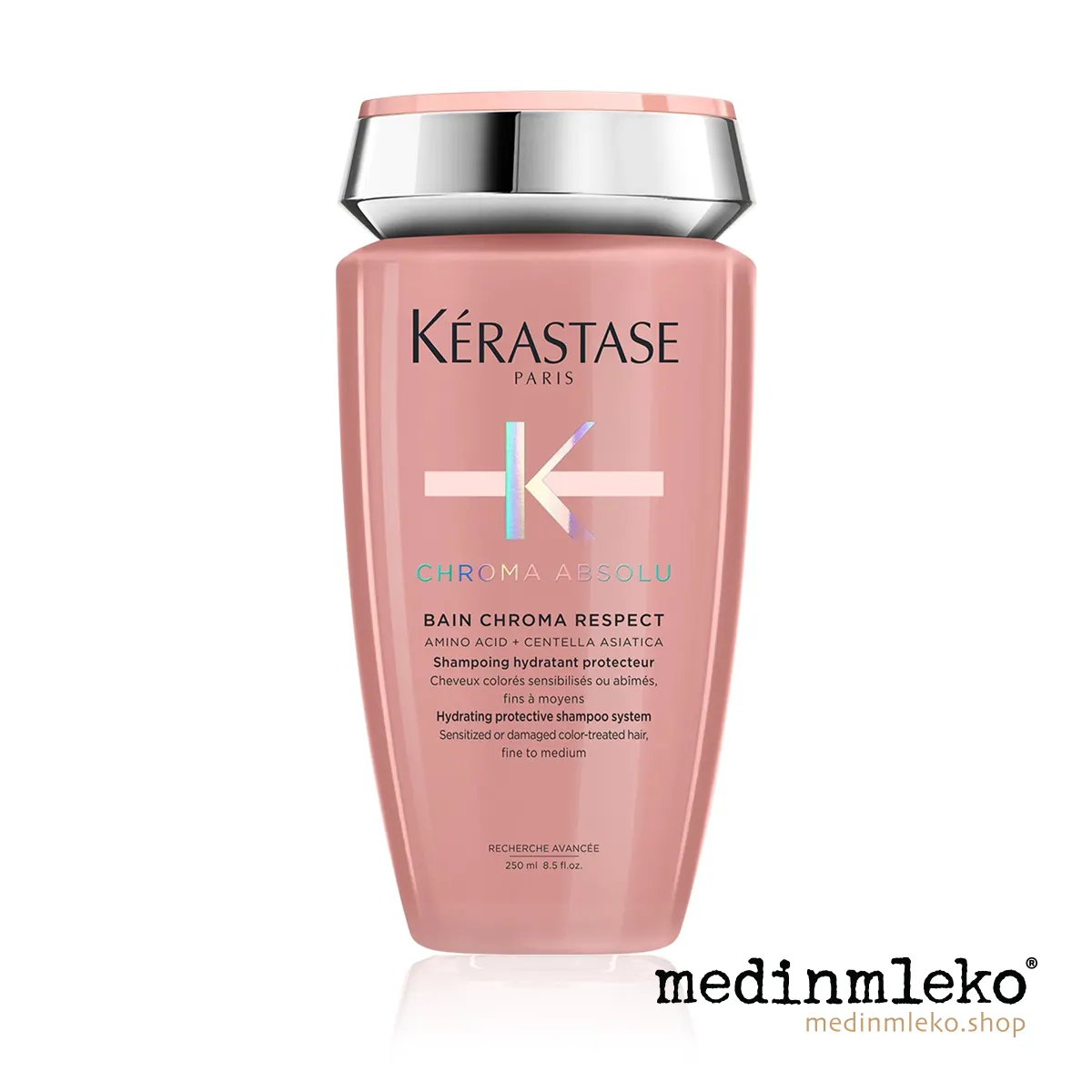 Šampon Kérastase Chroma Absolu Bain Chroma Respect učinkovito čisti lasišče, temeljito umiva lase in jim vrača naravno lepoto. Lahka formula, ki nežno očisti in vlaži lase, hkrati pa intenzivno neguje vlakna in ščiti barvo pred bledenjem.